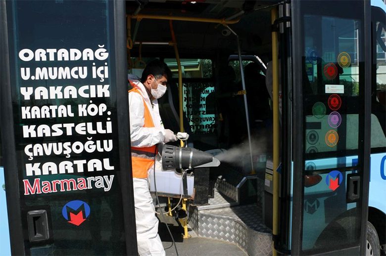 Covid-19 virüsünün neden olduğu salgın ile birlikte Kartal Belediyesi Temizlik İşleri Müdürlüğü’nün rutin faaliyetlerinden biri haline gelen dezenfekte çalışmaları ise tam kapanma döneminde de devam ediyor. 3 kişiden oluşan 4 farklı ekip tam kapanma döneminde faaliyette olan kamu kurumlarını, hizmet binalarını, toplu taşıma araçlarını, sağlık kuruluşlarını ve talep edilen binaları dezenfekte ediyor. Özel solüsyon kullanan ekipler, bu güne kadar 16 milyon metrekareden fazla alanı dezenfekte etti.