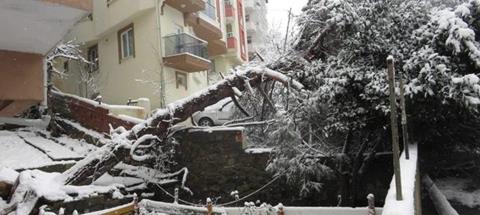 Kartal’da etkili olan kar yağışı, çam ağacının devrilmesine yol açtı. Devrilen ağaç, elektrik tellerini de kopardı.