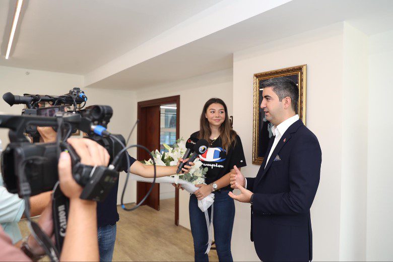 Kartal’da yaşayıp, büyümüş olan milli sporcu, Başkan Gökhan Yüksel’e Türk Milli Takımı forması hediye ederek, genç sporculara desteklerinden dolayı kendisine teşekkür etti ve Kartallı gençlere söyle seslendi: “Öncelikle makamında ağırladığı için Başkan Gökhan Yüksel’e çok teşekkür ederim. Sporun hayatımızda her zaman olması gereken bir şey olduğunu düşünüyorum. Önceliğimiz başarı değil de hayatımızda sporu bulundurmak olmalıdır. Özellikle Kartallı arkadaşlarıma seslenmek istiyorum. Ben de yıllardır burada yaşıyorum ve spor hayatıma profesyonel olarak başlamadım. Ben de çok kötü yerlerden yukarılara geldim, inşallah daha iyi olacağım. Ben onların her zaman yanındayım. Yani gerek belediyemizin takımı olsun gerek başka takım olsun, her zaman destekçiyim. Herkesin spora başlamasını kesinlikle öneririm. Bu sadece kendi branşımız için değil, her branş için geçerli. Spor hayattır ve yaşam stilidir. Bence istediği zaman herkes öğrenebilir.”